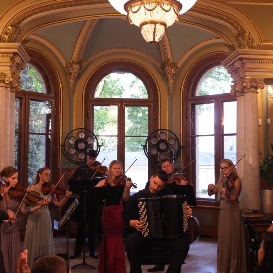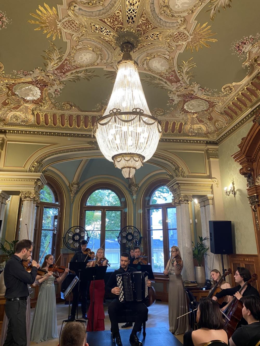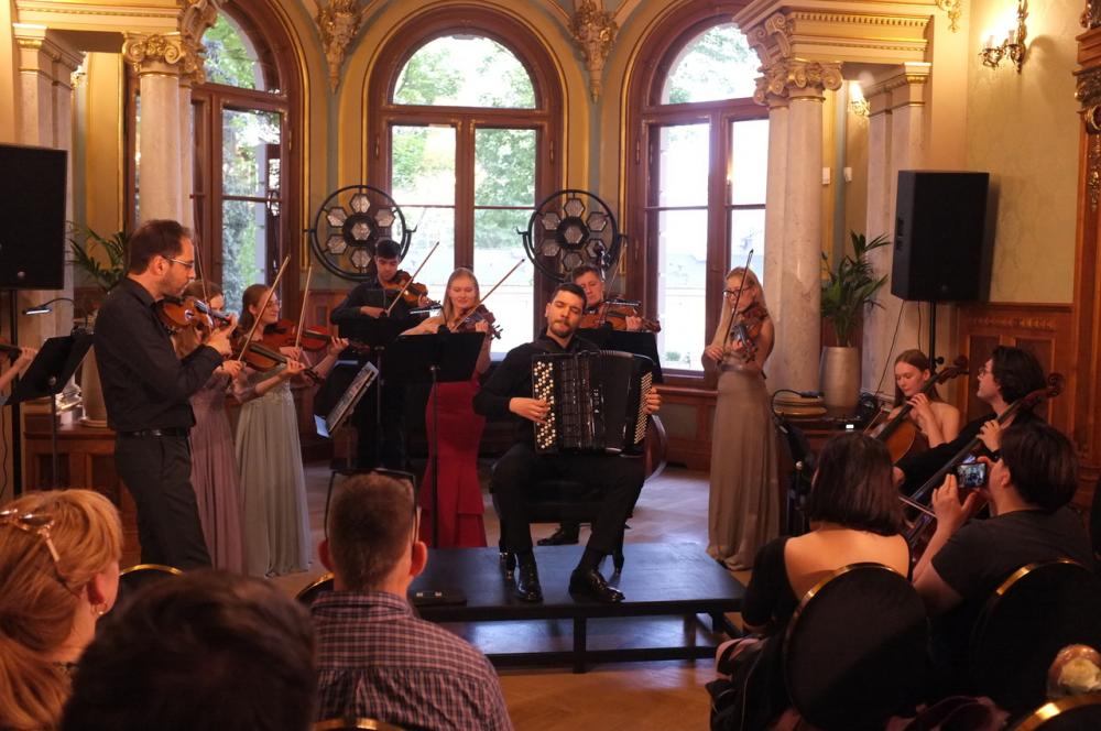 Otwierający spotkanie multimedialny wykład zatytułowany „Rejs po Luzytanii. Ze złotych kart Portugalii”, przybliżył stałym bywalcom szczecińskiej rezydencji przy al. Wojska Polskiego 84 mało znane wątki ciekawej historii Repúblici Portuguesa. W muzycznym programie wieczoru znalazły się natomiast utwory portugalskich kompozytorów Joly’ego Bragi Santosa i Luísa Tinoca. Publiczność gromkimi brawami przyjęła interpretację Koncertu nr 4 A-dur, BWV 1055 Johanna Sebastiana Bacha na klawesyn i orkiestrę smyczkową, opracowany przez João Barradasa na akordeon i orkiestrę smyczkową.