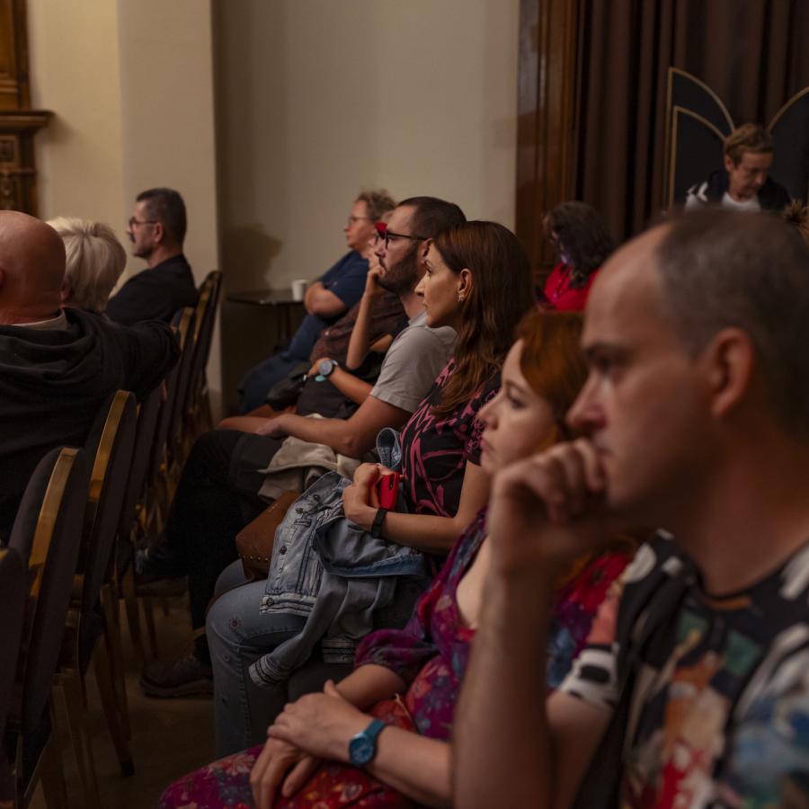 Pod koniec przepełnionej atrakcjami soboty w Willi Lentza odbyło się spotkanie z Tomaszem Sikorą, które poprowadził Marek Popielnicki (bezpośrednio po wernisażu wystawy OBRAZ i SŁOWO). Licznie przybyła na spotkanie z fotografem publiczność, z zadowoleniem zadawała pytania o twórczości i podróżach T. Sikory.